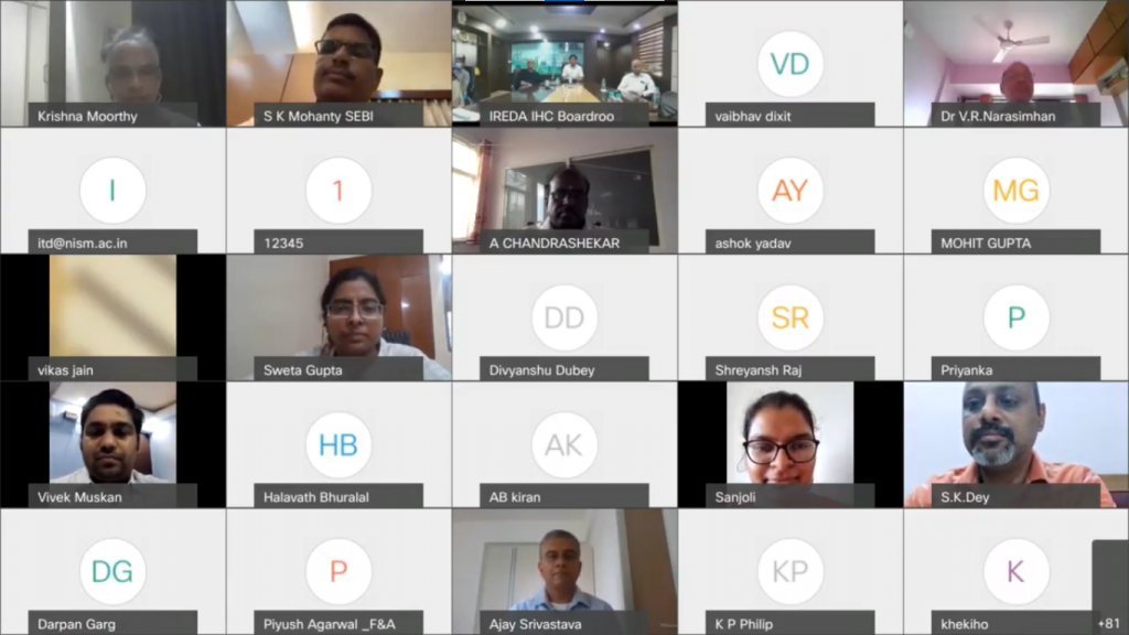 The School for Corporate Governance (SCG) of National Institute of Securities Markets (NISM) conducted a four-day Online Programme on ‘IPO Process’ for Officers of IREDA during July 17 – August 7, 2021. The programme was conducted on every Saturday for the Officers of IREDA.